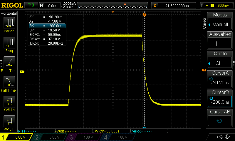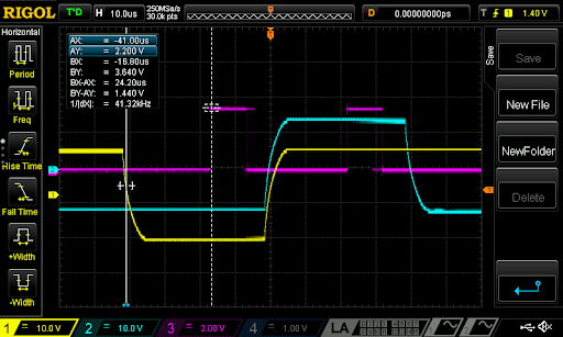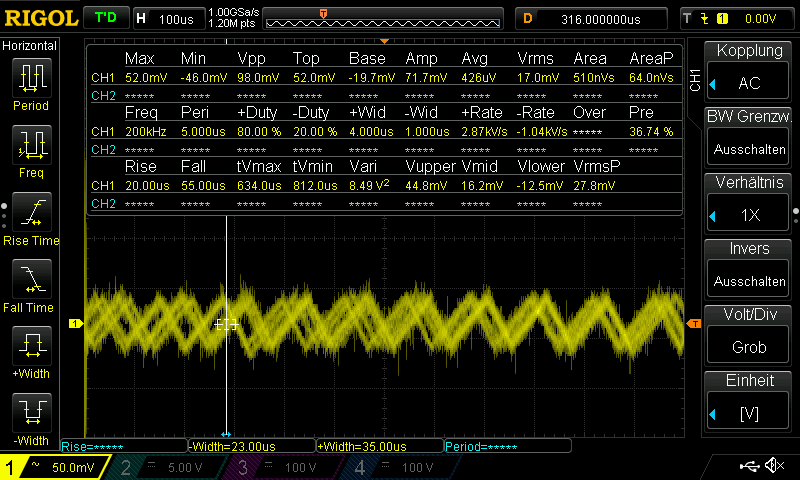 The second magenta pulse is nicely aligned with the high part of the PWM providing stable readings even at just 5% PWM. The 5% case is the more critical one, as very high duty cycles are not typically used.