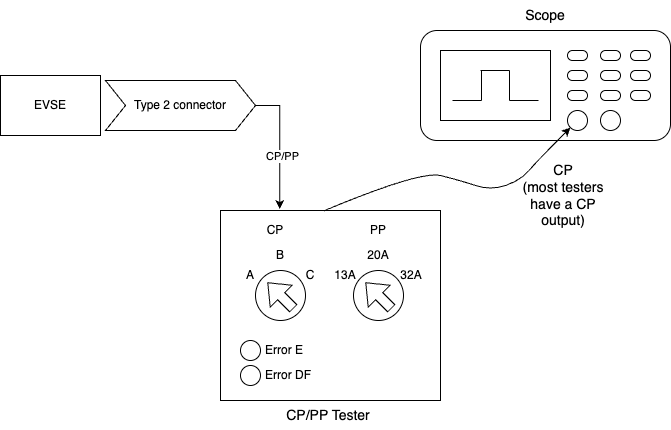 Connect your EVSE, the simulator and a scope similar to this: