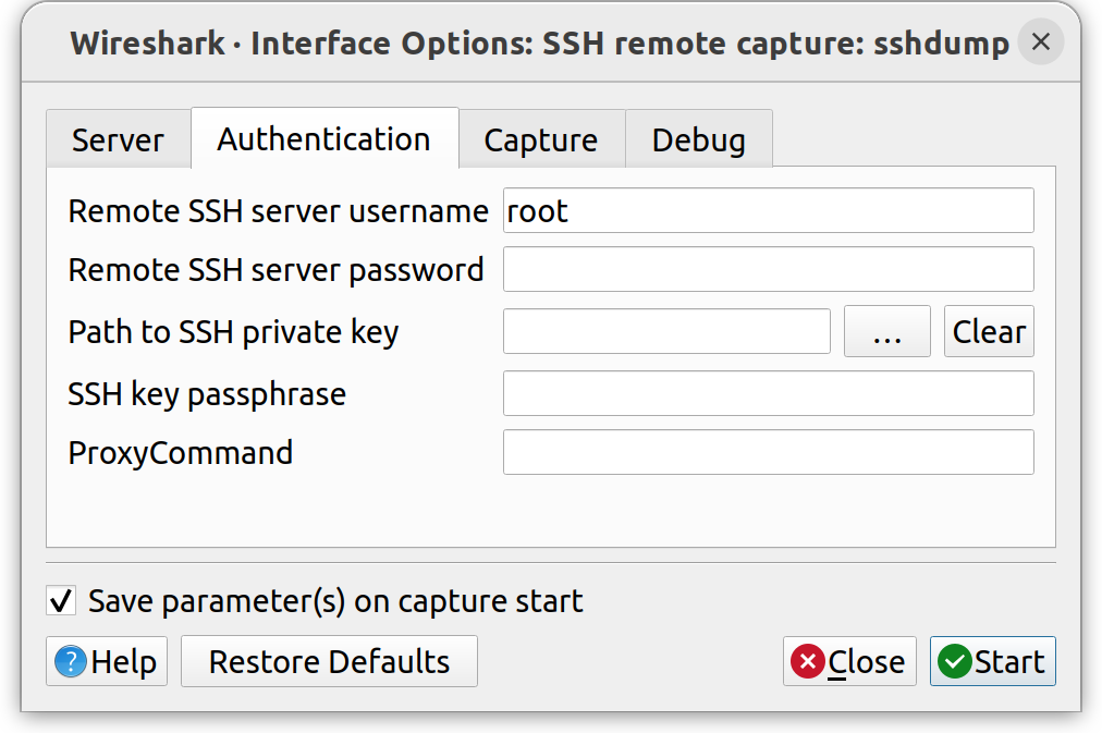 It is recommended to establish a passwordless SSH connection, as the password must be typed in every time a remote capture session is started. After setting this up e.g. via ssh-copy-id, select the path to your private key.
